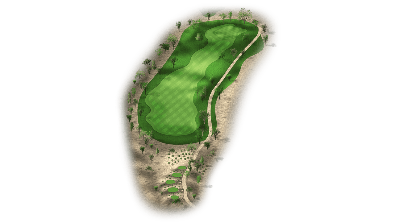 | The eighth is the longest par 3 on the golf course. It features a difficult two-tiered green and bunkers on the left side. Aim for the center of the green because par is a great score. |